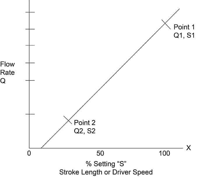 3、計(jì)量泵流量與沖程特性曲線呈線性關(guān)系(圖3)。然而,它不一定成比例,因?yàn)?50% 的沖程設(shè)置可能不等于 50% 的流量。這是因?yàn)樾?zhǔn)線可能不會(huì)同時(shí)通過兩個(gè)軸上的 0。通過在兩個(gè)沖程設(shè)置下測(cè)量流量,繪制兩個(gè)點(diǎn)并通過它們畫一條直線,可以準(zhǔn)確預(yù)測(cè)其他流量與沖程的關(guān)系。