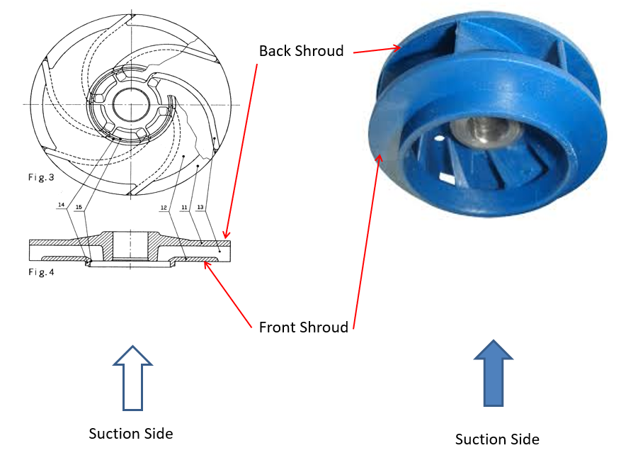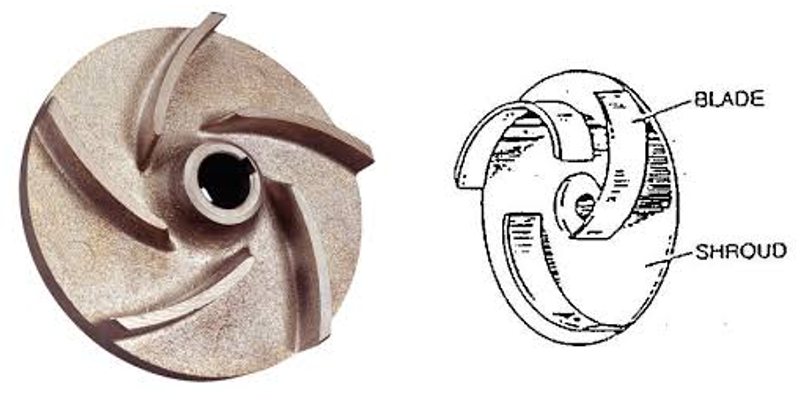 第一個,可以說是最堅固的設計是封閉式葉輪。在這種設計中,液體沿著由葉片形成的通道沿路徑向下流動,并通過兩個護罩在頂部和底部(或根據軸方向的前后)“封閉”。下面的兩張圖片說明了這種設計。