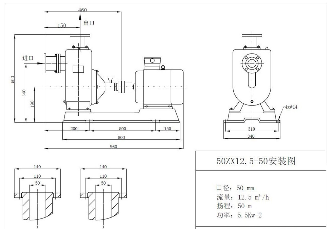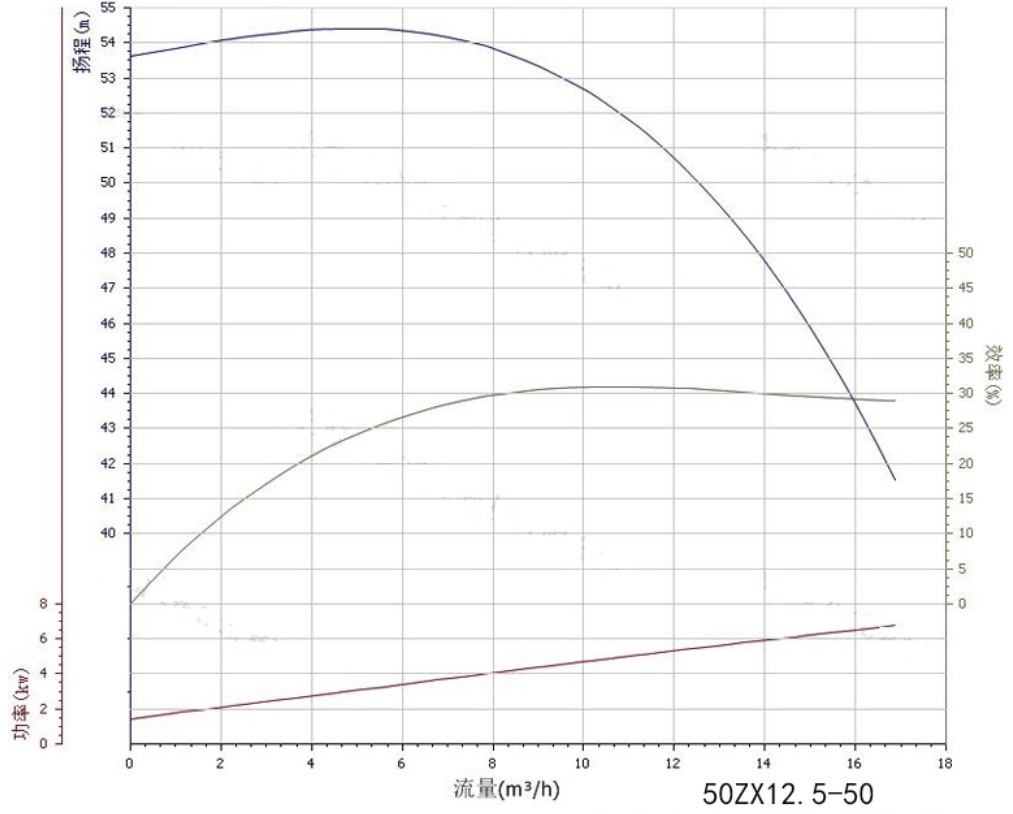 50ZX12.5-50自吸泵型號(hào)前面的50代表進(jìn)出口口徑為50mm、ZX表示為自吸式離心泵、12.5代表額定流量12.5立方米每小時(shí)、50表示泵的額定揚(yáng)程50米、自吸高度為5米,配用5.5KW功率電機(jī)。如果用戶要求吸程較高,還可以加裝真空輔裝置,做成吸程可達(dá)9米的高吸程自吸泵。應(yīng)當(dāng)注意的是,因?yàn)樽晕脜?shù)是使用清水測(cè)試而得出的,但在使用中會(huì)因?yàn)檩斔徒橘|(zhì)的粘度及管道損耗等原因,導(dǎo)致實(shí)際使用中流量、壓力參數(shù)減小。所以在選型的時(shí)候應(yīng)當(dāng)留有一些余量,尤其在工況要求揚(yáng)程必須達(dá)到50米時(shí),建議選大一個(gè)自吸泵型號(hào),選擇50ZX15-60自吸離心泵使用。